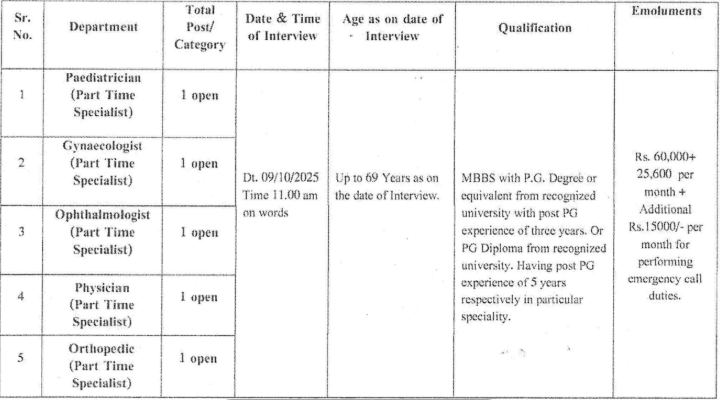 Maharashtra State Employees’ Insurance Society Hospital, Vashi Navi Mumbai has announced recruitment for Part-Time Specialist posts on contract basis. Applications are invited for one post each of Paediatrician, Gynaecologist, Ophthalmologist, Physician, and Orthopaedic Specialist. Candidates must hold an MBBS with a recognized PG degree or diploma along with minimum 5 years’ post-PG experience in the relevant specialty. The honorarium offered is ₹60,000 + ₹25,000 per month, with an additional ₹13,000 for emergency call duties. Applicants must submit the prescribed documents with a Demand Draft (₹300 for UR/EWS/OBC, ₹125 for SC/ST, and exempted for Women & PWBD candidates). The last date to apply is 7th October 2025 (up to 4:00 PM), while the interviews will be held on 14th October 2025 at 11:00 AM, where candidates should report one hour prior.