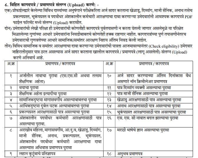 १. वर्गवारीच्या दाव्यानुसार जातीचे प्रमाणपत्र २. वर्गवारीनुसार उन्नत व प्रगत गटात मोडत नसल्याचे सक्षम प्राधिका-यांनी दिलेले प्रमाणपत्र (NCL प्रमाणपत्र) NCL वैधता कालावधी नमुद करावा. ३. जात पडताळणी प्रमाणपत्र (असल्यास) आर्थिकदृष्ट्या दुर्बल घटकातील उमेदवारांनी शासन निर्णय दिनांक ३१ मे २०२१ नुसारचे प्रमाणपत्र महाराष्ट्रातील अधिवास प्रमाणपत्र (डोमिसाईल प्रमाणपत्र)