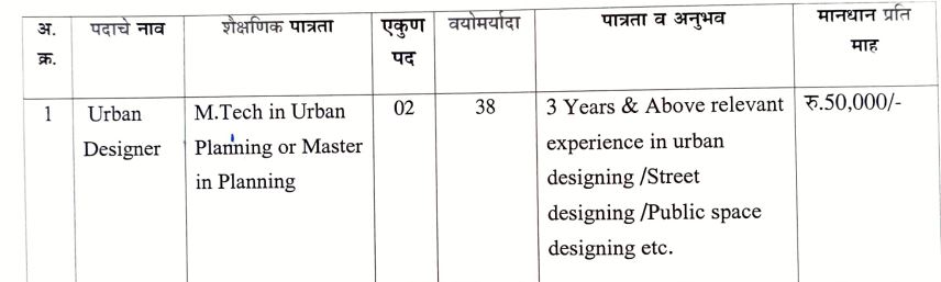 नागपूर महानगरपालिकेच्या आस्थापना शाखेत सार्वजनिक बांधकाम विभागाच्या Urban Design Cell अंतर्गत “Walkable Street Concept” राबविण्यासाठी Urban Designer पदासाठी थेट मुलाखत घेतली जाणार आहे. ही नियुक्ती कंत्राटी तत्त्वावर प्रथमतः ६ महिन्यांसाठी केली जाणार आहे. उमेदवारांकडे M. Tech in Urban Planning किंवा Master in Planning असणे आवश्यक आहे, तसेच ३ वर्षांचा संबंधित अनुभव आवश्यक आहे (Urban Designing / Street Designing / Public Space Designing).एकूण २ पदे आहेत. उमेदवाराची वयोमर्यादा ३८ वर्षे असून, मासिक मानधन रु. ५०,०००/- आहे. इच्छुक उमेदवारांनी दि. १५/१०/२०२५ रोजी सकाळी १०:३० ते १२:०० वाजता आवश्यक कागदपत्रांसह उपस्थित राहावे. विहीत वेळेनंतर येणाऱ्या उमेदवारांची नोंद केली जाणार नाही. पात्र उमेदवारांची मुलाखत त्याच दिवशी घेतली जाईल.